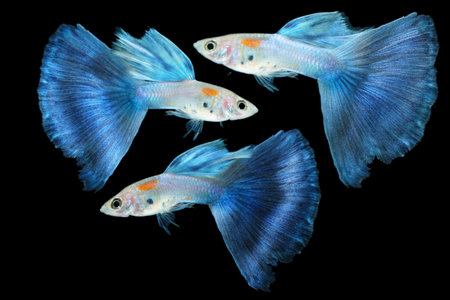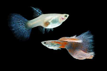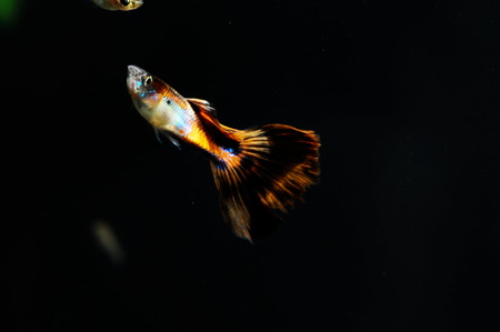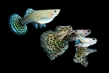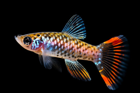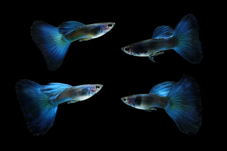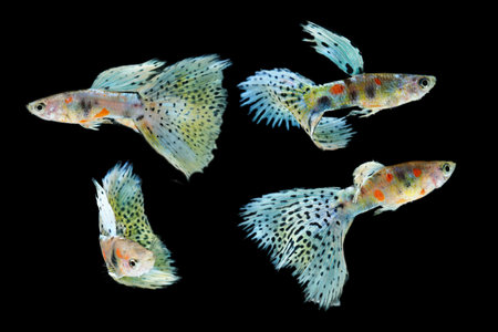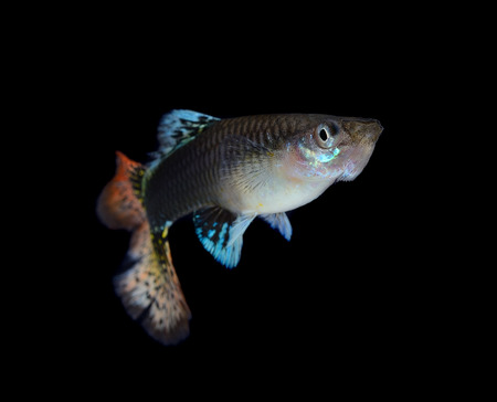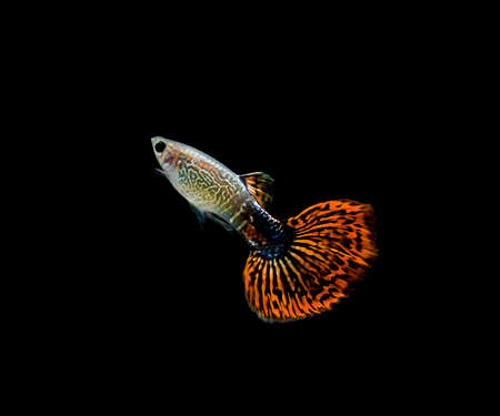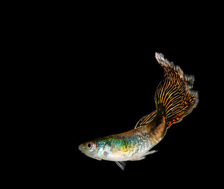 Fish in aquarium. Beautiful Guppy glides gracefully, its shimmering colors like strokes of living light. Each delicate fin flows like silk in water. Guppy isolated on black.