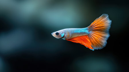 A vibrant guppy is featured, showcasing yellow, orange, and white coloration. The image presents an underwater view with a shallow depth of field. The fish is captured in detail, emphasizing its scales and fins. This photo is suitable for various commercial uses, including educational materials.