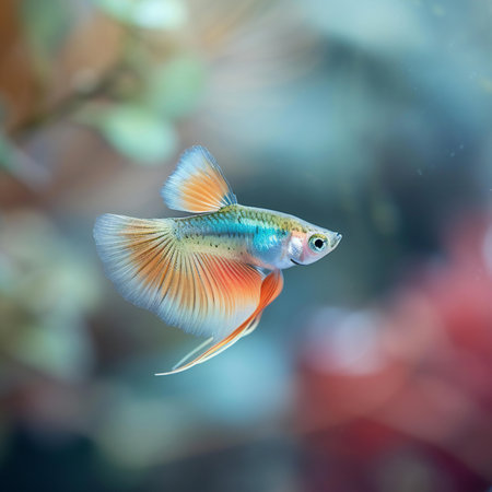 A peaceful guppy fish swimming alone in a serene aquarium.