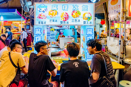 TAIPEI, TAIWAN - JUNE 19: This is a group of Taiwanese people sitting at a shaved ice dessert vendor in the Raohe street night market on June 19, 2017 in Taipei