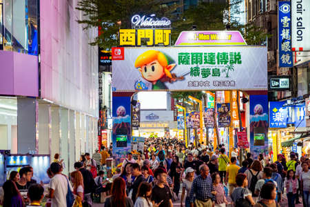 2019, October 7th, Taiwan, Taipei, Ximending Night Market - The scene with crowded people and vendors at the famous night market in the city.