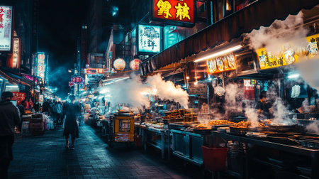 A bustling street scene at night features a crowd of people walking and gathering. Various shops and stalls line the street, illuminated by bright lights and signs. The composition suggests a lively atmosphere with diverse activities. Suitable for editorial use, the image captures a moment in a public setting.