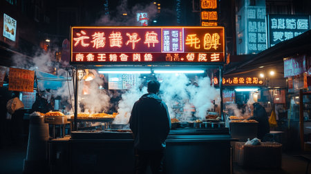 A brightly lit street food stall at a night market features a large wok and various fresh ingredients in bowls. Traditional menus with Chinese characters hang above the cooking station, highlighting local culinary culture.