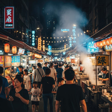 Crowds enjoy food and shopping at a vibrant night market in a bustling city