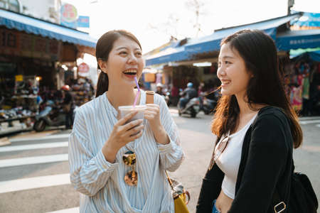 japanese woman laughing cheerful while drinking tasty local specialty beverage and friend standing beside looking at her. smiling girl travelers trying tasting taiwan food during visiting in market.