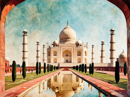 A majestic palace of white marble, the Taj Mahal stands tall in the city of Agra, India, with its intricate Hindu temple architecture and grand mosque. AI Generative Illustration Graphic Design Art