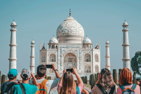 Agra, India - 8 November, 2018: Tourists taking pictures of the Taj Mahal. Wonderful view of the white marble mausoleum at morning time..