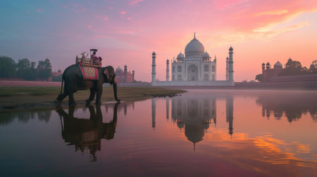 The Taj Mahal, a white marble mausoleum built by Mughal emperor Shah Jahan in memory of his third wife Mumtaz Mahal, stands majestically in Agra, India. The building is reflected in a calm pool of water that stretches out in front of it, adding to the beauty of the scene. The sky is a soft blue, and the sun is just beginning to rise, casting a warm glow on the building.