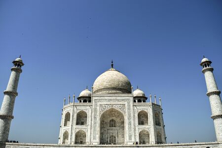 Awesome view of the Taj Mahal on blue sky background in Agra, India. The white marble mausoleum is a popular tourist attraction of South Asia.