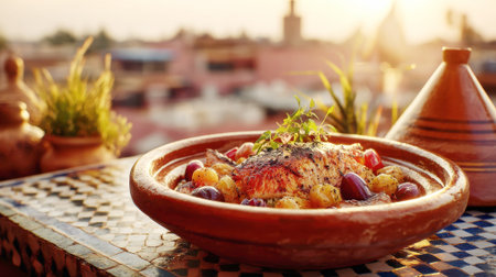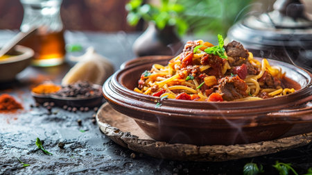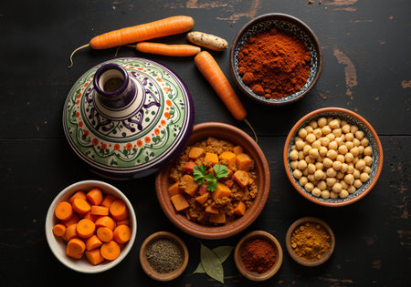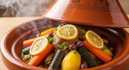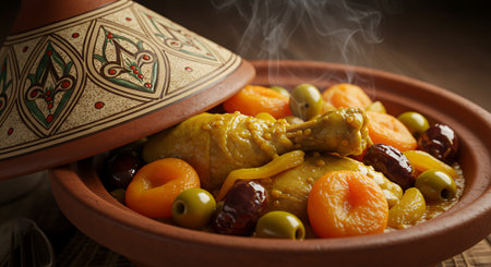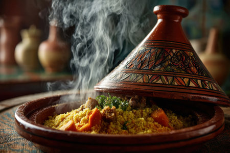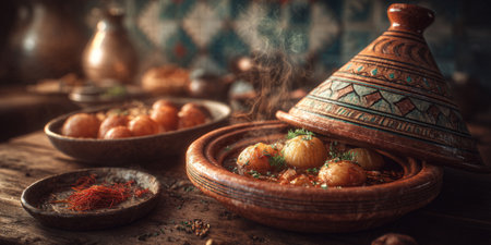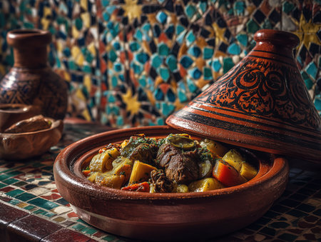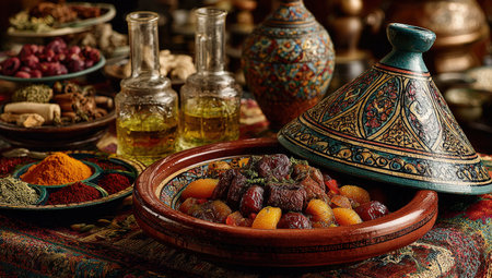Moroccan tagine brimming with meat and vegetables, surrounded by spices and oils, reflects traditional culinary artistry and vibrant cultural elements in a warm setting