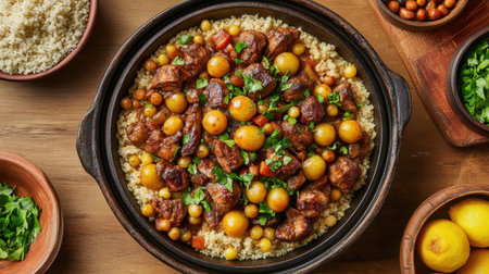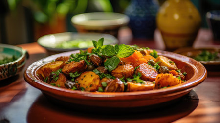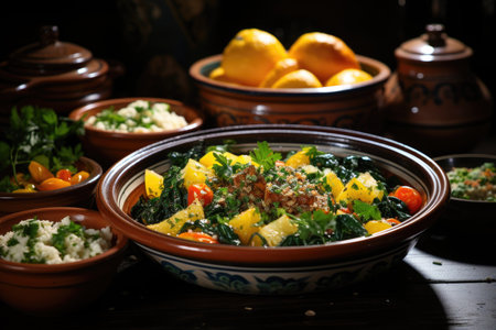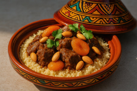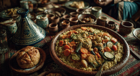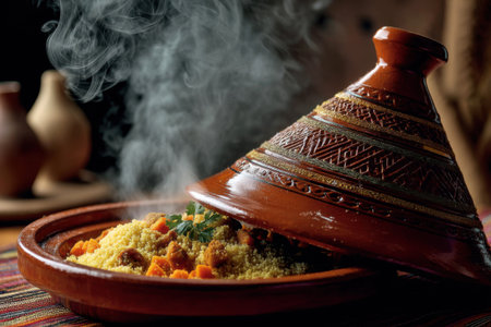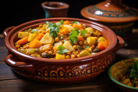 moroccan tagine with couscous and vibrant vegetables, created with generative ai