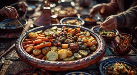 Traditional Moroccan dish with spiced meat and roasted vegetables on a vibrant platter, surrounded by hands enjoying the meal, creating a communal dining atmosphere
