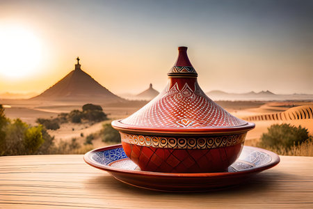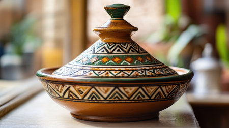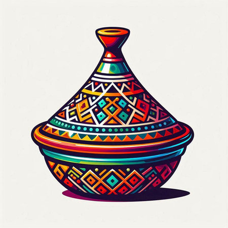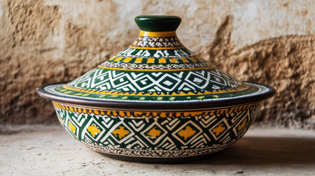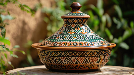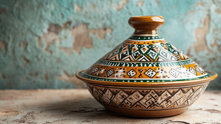 Explore the intricate design of a traditional Moroccan tagine pot, showcasing vibrant colors and craftsmanship. Perfect for culinary enthusiasts and cultural representation.