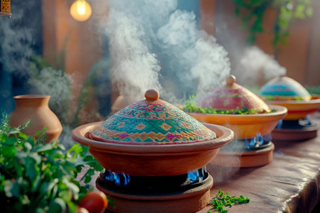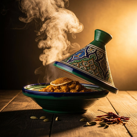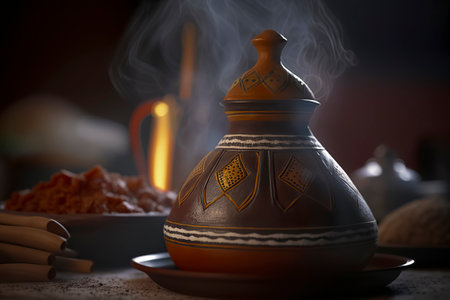 steaming tagine pot in a cozy setting with various cooking ingredients, suggesting a traditional or rustic kitchen