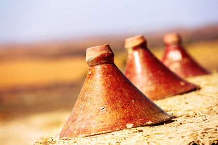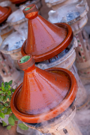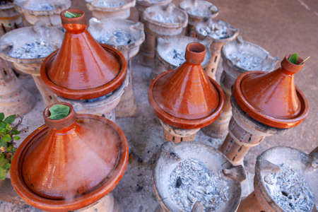 Tajines during traditional cooking with coke. Marrakech