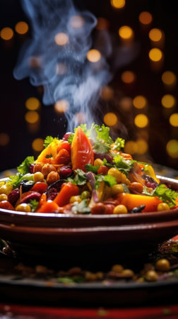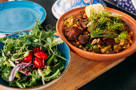 Traditional Moroccan tagine with lamb, vegetables, and nuts served with a fresh side salad. Highlights vibrant Mediterranean flavors and culinary artistry.