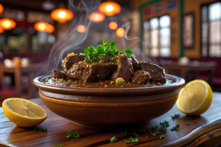 Traditional dish with tender meat and vegetables in an ornate bowl, placed on a vibrant patterned tablecloth, highlighting rich culinary traditions and textures