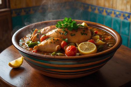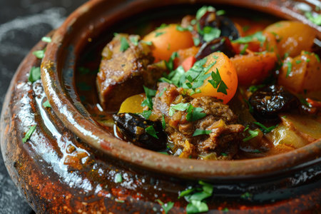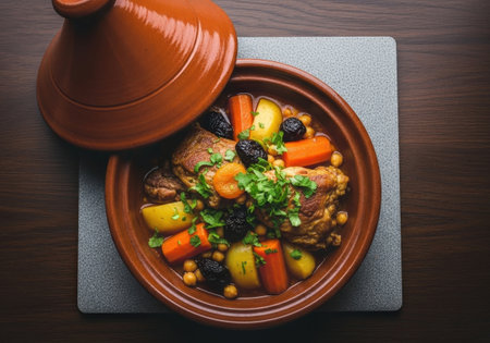 A bowl of traditional Moroccan tagine, vegetables and meat and spices, AI
