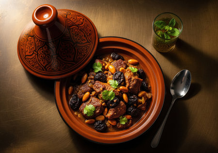 Algerian lamb tagine with prunes and almonds. This traditional North African stew is served in an ornate clay pot with fresh mint tea.