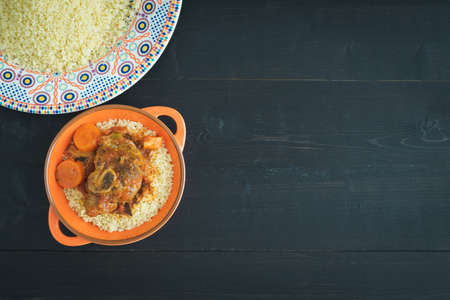 Casserole with lamb meat and couscous on black background. Copy space. Couscous dish. Ramadan cooking. Top view.