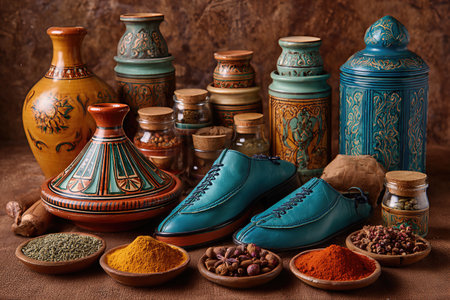 A Vibrant Display of Traditional Artifacts Featuring Colorful Shoes, Spice Bowls, and Decorative Jars in an Artistic Arrangement on Rustic Background