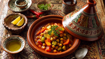 Traditional Moroccan tagine stew with chickpeas, carrots, zucchini, and spices served on a patterned table