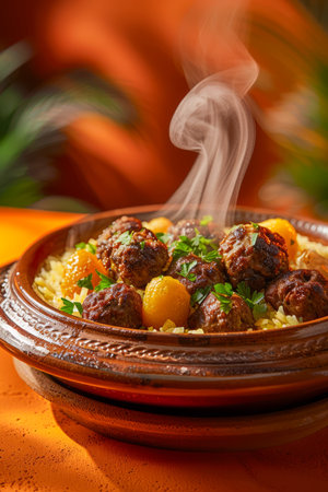 Traditional Moroccan Tagine Dish with Steaming Meatballs and Couscous Garnished with Fresh Parsley on Rustic Table AI Generative