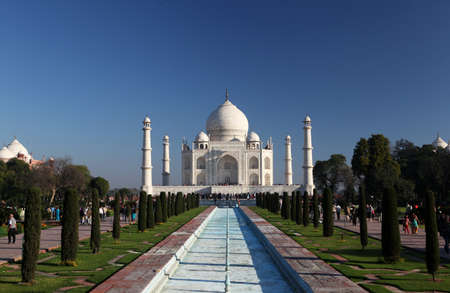 AGRA, INDIA - JULY 17, 2013: Mass tourism and a lot of tourists in front of the Taj Mahal monument in Agra, India with water pools and stairs
