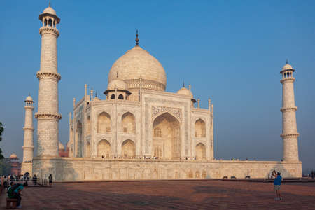 Agra, India - 8 November, 2018: Tourists taking pictures of the Taj Mahal. Wonderful view of the white marble mausoleum at morning time..