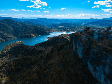 Reservoir Pantano De Siurana, Tarragona, Spain. Top view. Copy space for text