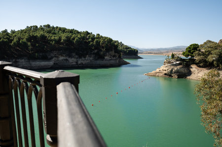 A scenic view of Conde de Guadalhorce Reservoir and its turquoise water in Malaga, Andalusia, Spain