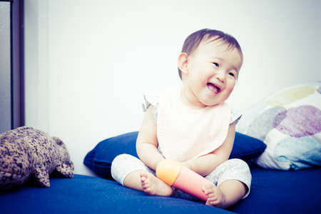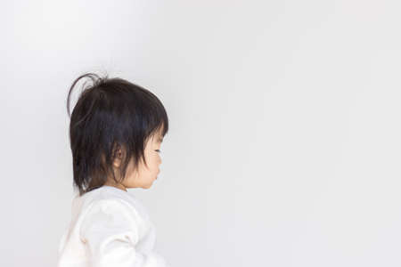 Asian baby with a serious look when waking up