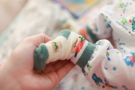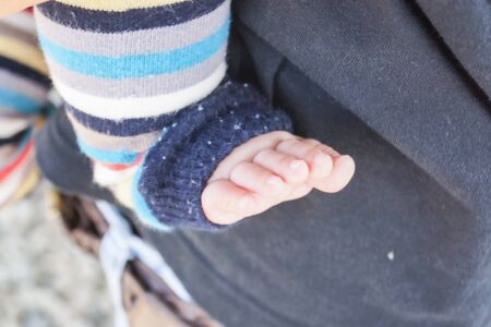 Feet of baby close up. Childish legs on blurred background.