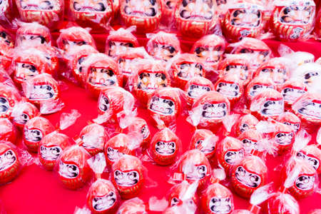 Traditional Japanese tourist souvenirs and gifts from Kyoto, Kansai, Japan, with daruma figures, kitsune fox, tengu mask, refrigerator magnets, toys figurines, key ring keychain, in a local vendor gift shop