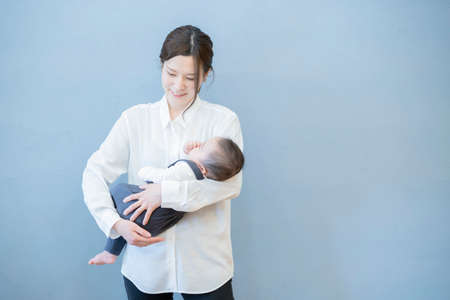 Asian young mom holding a baby with smile