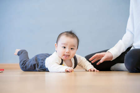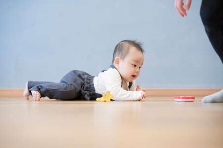 Japanese baby crawling on the wooden floor in the room