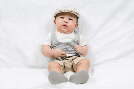 Portrait of a beautiful 4 months newborn smiling, on white background.Cute baby boy smiling.