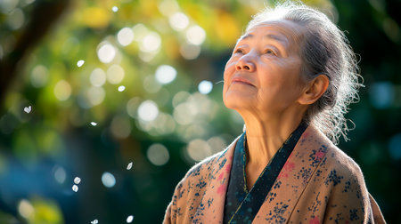 A graceful Japanese woman 70 years old wears a traditional kimono adorned with floral patterns while posing in beautiful garden. The tranquil surrounding enhance her dignified presence. Generative AI.