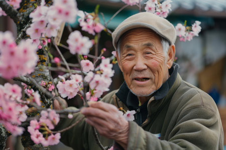A Japanese man selling delicate cherry blossom branches at a serene garden, embodying the grace and harmony of traditional Japanese flower culture.