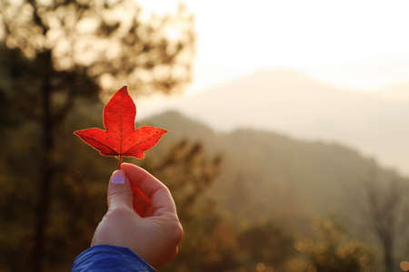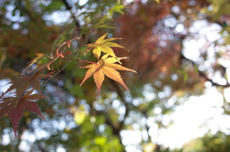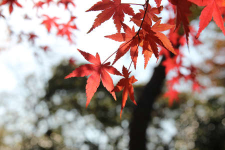 Beautiful maple leaves in autumn sunny day at foreground and blurry background in Taiwan, with no people, close up, copy space, macro shot.
