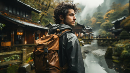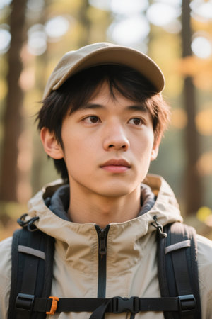 Young Asian student with a backpack outdoors. Young refugee guy. Concept of immigrant education, refugee resilience, international education, diversity, and cultural integration. Vertical format