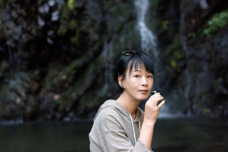 Asian tourist woman posing and smling to camera with autumn garden background in autumn season.