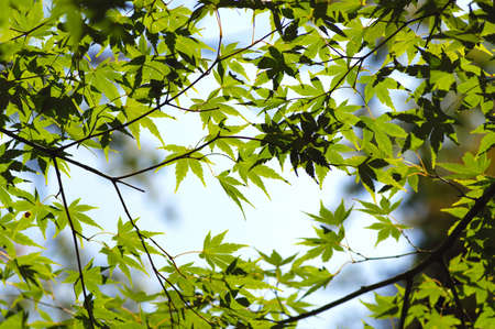 Maple leaf color is changing colors in the fall, with the sky background and the temple roof as background.