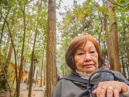 Portrait Senior asian women on Zhangjiajie National Forest Park in Wulingyuan District Zhangjiajie City China in the Foggy day
