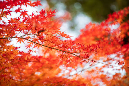 Red maple leaves in autumn season with blue sky blurred background, taken from Japan.