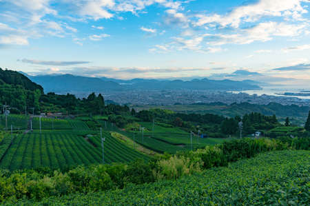 Aerial view of green tea plantations and Shizuoka city
