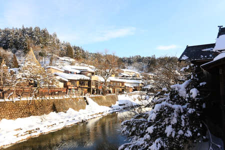 View of Takayama village and miyagawa river with winter snow in Gifu, Japan