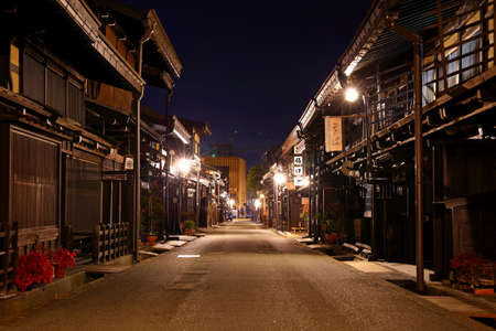 Japanese Torii pole at Miyamae Bridge at night in Takayama old town, Gifu, urban city in Japan. Architecture background.