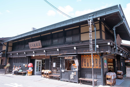 MAY 27, 2013 Takayama ,Gifu, Japan - Old vintage local shop nice wooden exterior of Sanmachi Suji old Edo district, famous shopping and tourist attraction of Takayama old town.