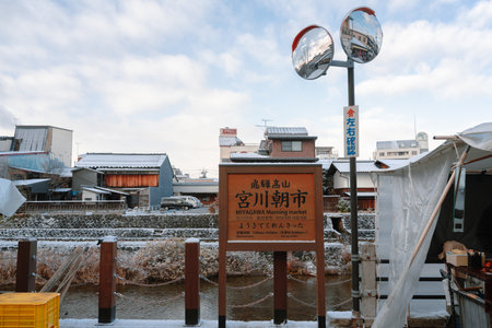 Takayama, Gifu, Japan - December 18, 2023: Miyagawa morning market with winter snow